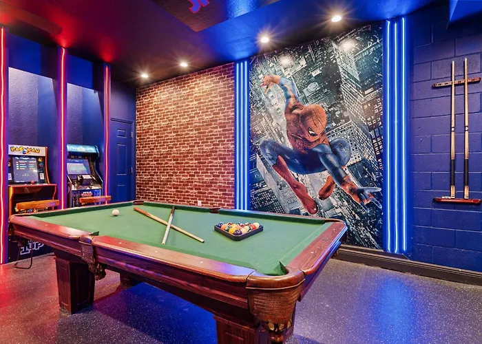 Cet établissement Villa 6Br Fun In The Sun With Free Water Park à Orlando est situé à environ 25 minutes à pied du boulevard Emerald Island et propose du mini-golf aux clients actifs. Cette villa de 6 chambres dispose d'une piscine extérieure et d'une thérapie Spa, tandis que le Parc à thème Disney's Animal Kingdom® se trouve dans une zone de 4 km.